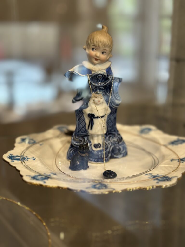 世界中の蚤の市で出会ったヴィンテージやアンティークの陶器たち。少し欠けてしまったもの、時を経て役目を終えたもの、誰かの暮らしの片隅で静かに佇んでいたもの。セットデザイナーでありアーティストのHITOMI が、それらを丁寧に拾い上げ、アッサンブラージュ(立体コラージュ)という、シュールレアリズムの流れを汲む技法で繋ぎ合わせて、新たな呼吸と表情を吹き込みジュエリートレイを制作しました。